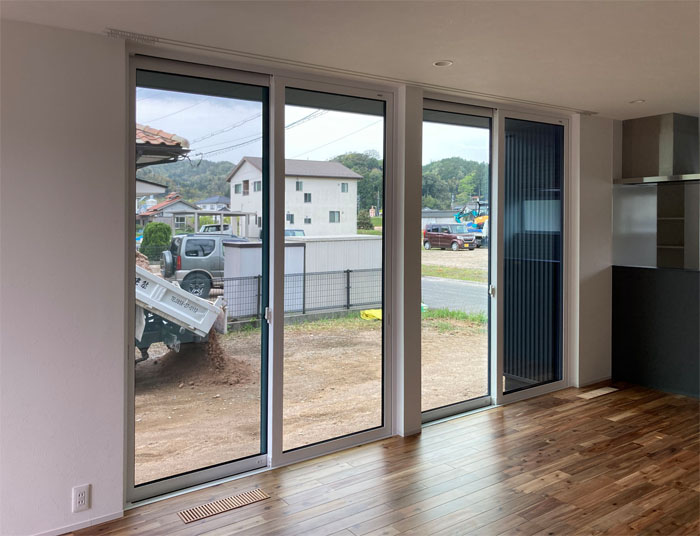 天井から床までの大きな掃出し窓に天井埋込用のTOSOシエロライン(カーテンレール)が設置済みでした。