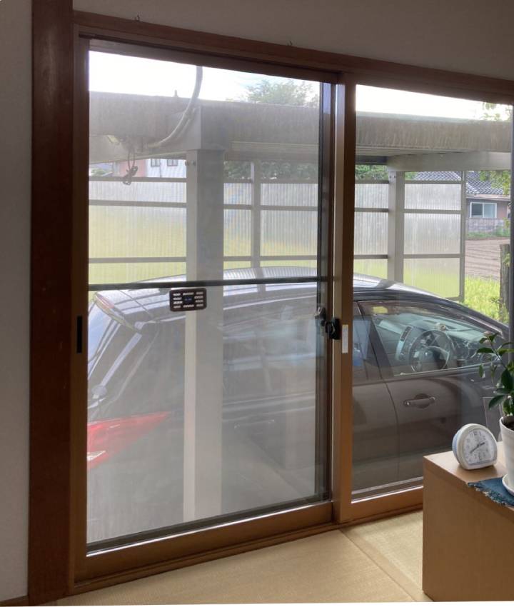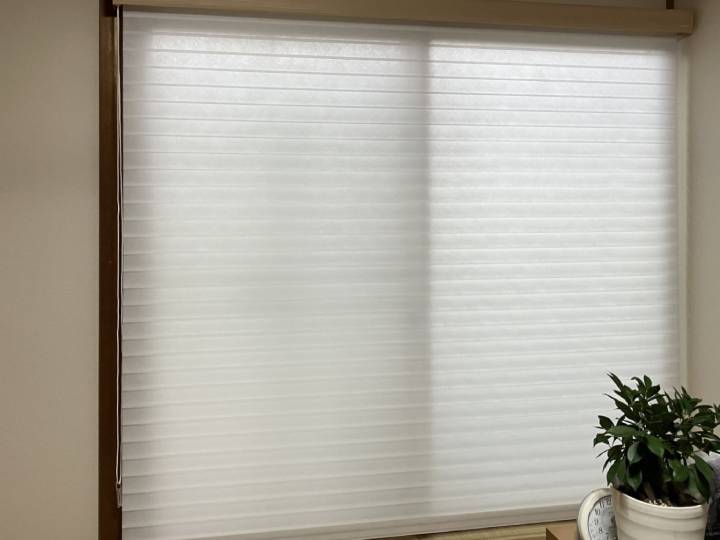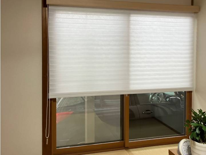 N様の和室に似合う雰囲気の調光ロールスクリーン、ニチベイのハナリをオススメしました。部屋を暗くする事なく、プライバシーも守られています。