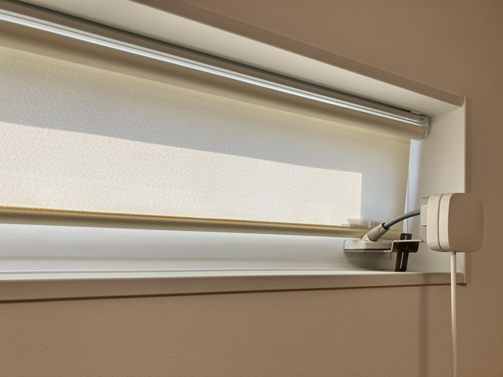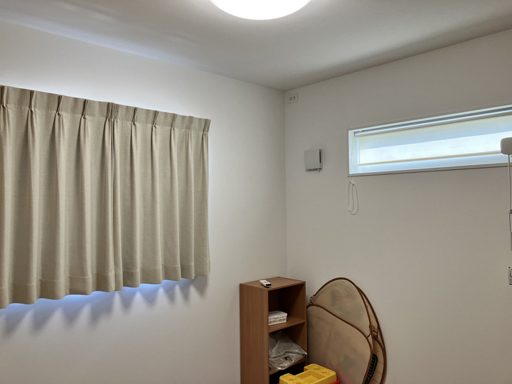 オペレーターハンドルが付いている子供室には、天付けで小窓用ロールスクリーンを設置しました。出っ張りが8㎝あり、隠そうとすると逆に不自然だったので、あえて隠そうとせず通常よりメカ部分が小さい小窓用のロールスクリーンをご提案しました。主寝室のカーテンレール、ロールスクリーンの部品色はダークブラウン系、子供室はホワイト系にして少し違った雰囲気を楽しんでいただきました。調光ロールスクリーンは建具の色に合わせたカバー付きのタイプにして和室の趣をいかしました。子供室のオペレーターハンドルのある窓は、結果的にスッキリした印象でまとめました。