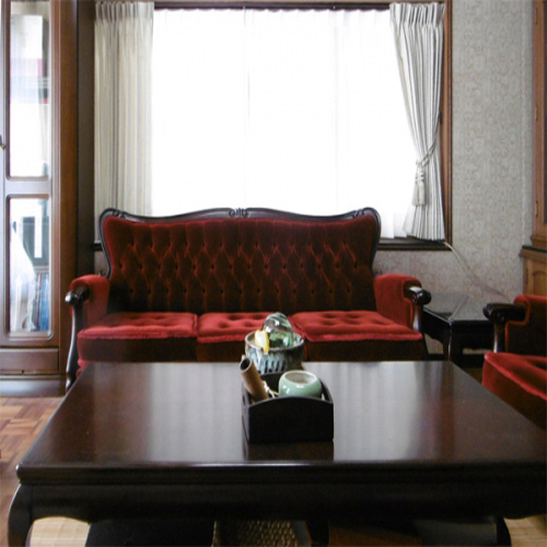 応接室のクラシックなソファを引き立てる為、アイボリーのカーテンを取付。