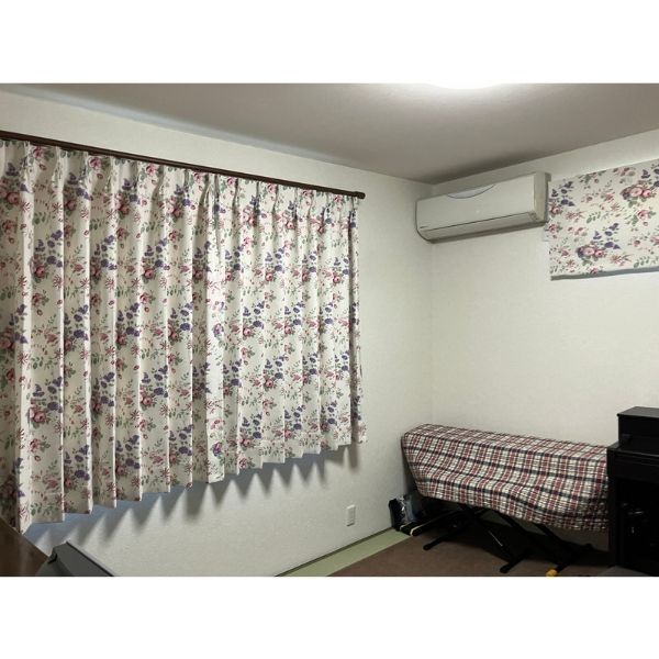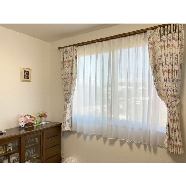 以前お使いになられていたブラウン系のカーテンとは印象がガラッと変わりました。華やかで可愛らしさのあるお部屋になり、気に入っていただけました。