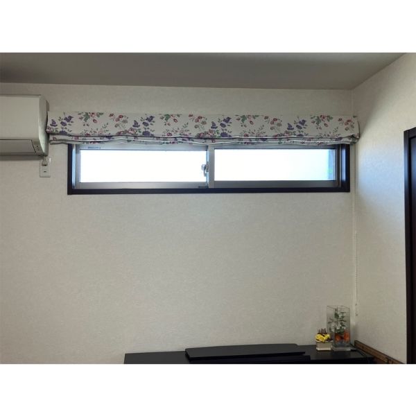腰高窓はドレープとレースカーテン、高窓にはシングルシェードが付いています