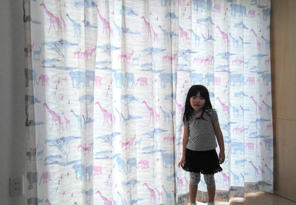 それぞれのお部屋のイメージに合ったカーテンを取付させてもらい、喜んでいただきました。サファリ柄のカーテンは夢が広がる感じで、可愛い笑顔の写真を撮らせていただきました。