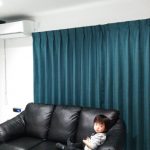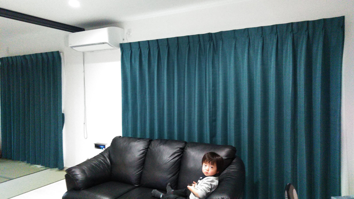 スペインのブランド、シビラのオーダーカーテンです。上品な光沢の深い青緑色のカーテンは男女問わず好まれる雰囲気です。