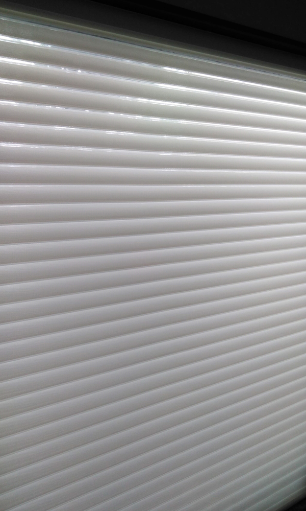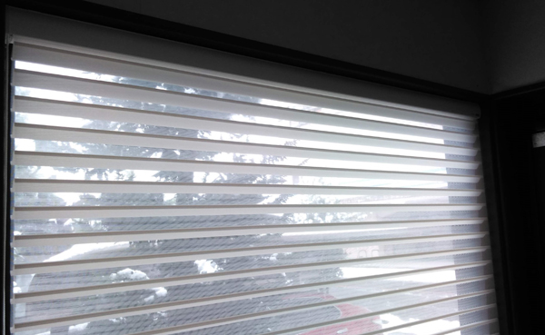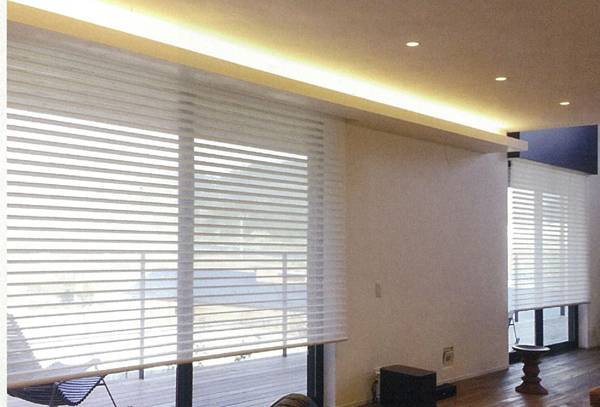 透明ガラスの為、現状のロールスクリーンは開けると外から玄関が丸見えになってしまう為、いつも閉めている状態でした。開放感のある大きな窓の存在を生かすために、レースとカーテンの役割ができる3D調光ロールスクリーンをお勧めしました。室内からは外の景色が見えますが、外から室内が見えにくい画期的なロールスクリーンです。以前は外国製の高価なブランド商品がありましたが、国産でデザインと機能を兼ね備えたFUGAを提案させていただきました。