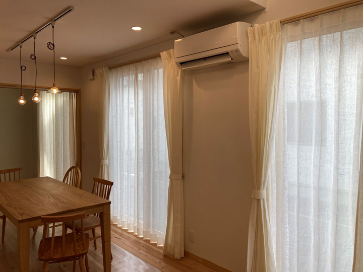 イメージ通りの窓辺になった様子で、とても喜んでいただきました。カーテンはもちろんダイニングテーブルセットや照明もイメージを大切に選ばれた様子がうかがえます。家族皆様が心地良く過ごされる事が想像できます。