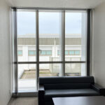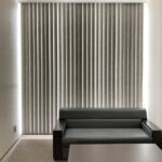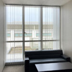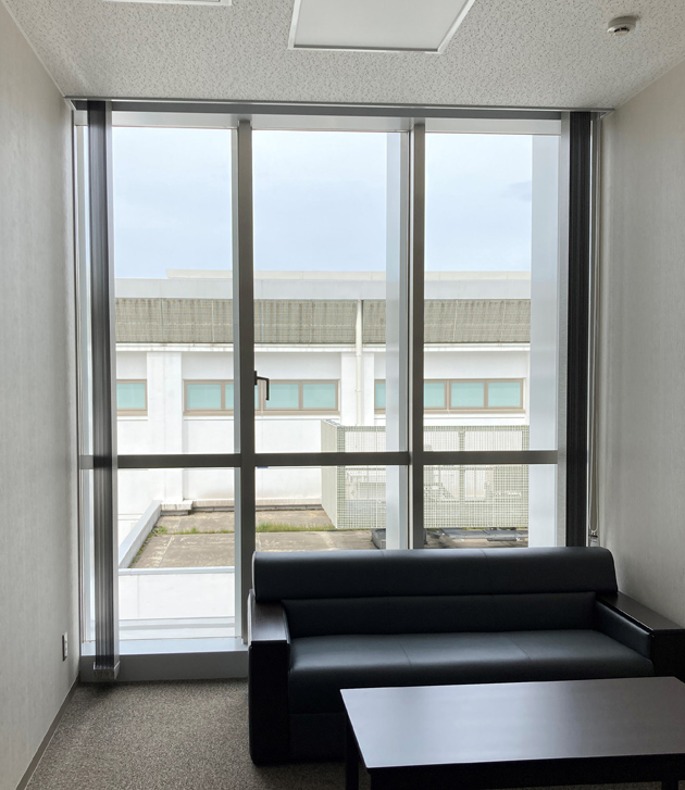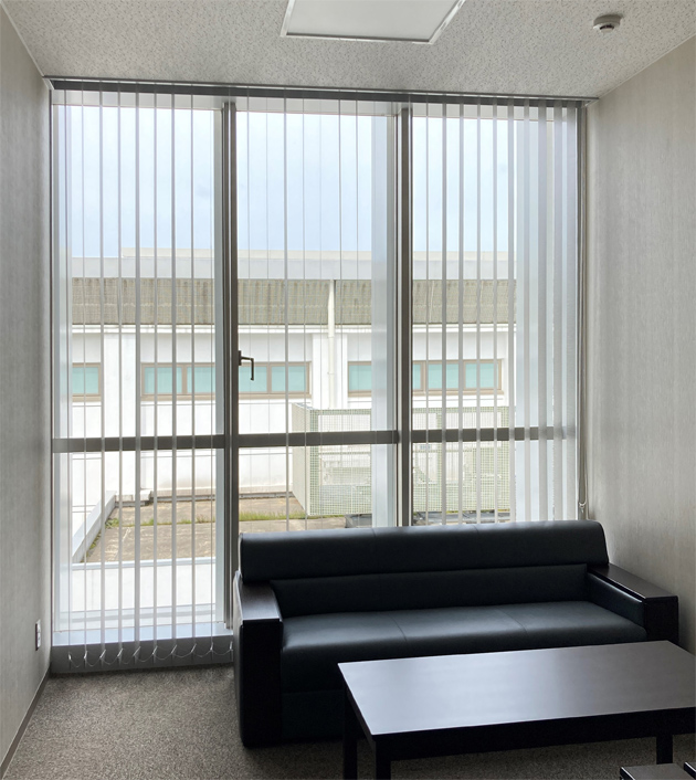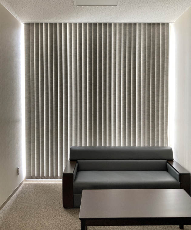 横型ブラインド、カーテンは壁の色に合わせたアイボリー色にしました。落ち着いて、時には集中できる空間です。応接室の縦型ブラインドはミックス感のある織りを表現したデザインの生地で、特別な雰囲気をかもしだしています。