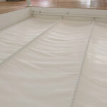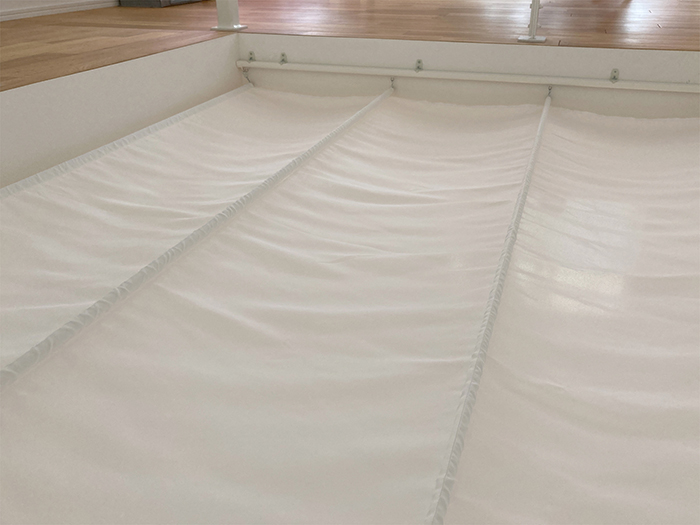 夏と冬だけ閉じて使える様に可動式の天幕を設置する事にしました。これまでは、明るさがそのまま1階まで入っていたので、暗くならない様に採光拡散の機能を持ったレースカーテンで天幕を作りました。採光拡散レースは光を広範囲に拡散させる機能がありレースカーテンが無い時よりもお部屋が明るくなります。