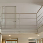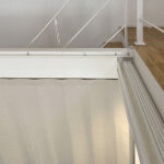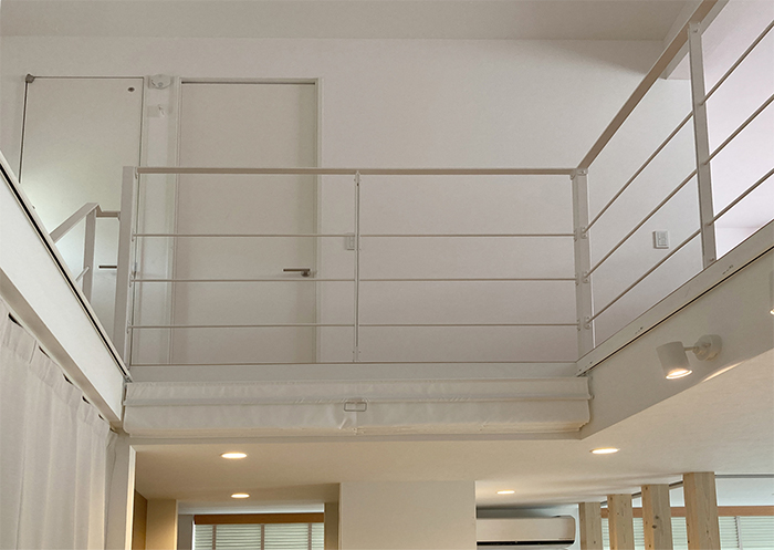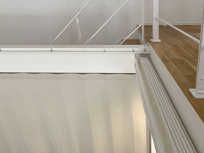 全開した時に1階の天井より生地が下がらないように計算をしてポールの本数を決めました。吹き抜けの狭い方の両端にカーテンレールを設置、ポールに通した天幕を取付しました。開閉は1階から天幕に取り付けたグリップに操作用バトンを引っ掛けて行います。すぐ横にある階段からも冷暖房が抜けてしまうので、階段下スペースの目隠しもかねてヒダの無い無地のカーテンを取付しました。