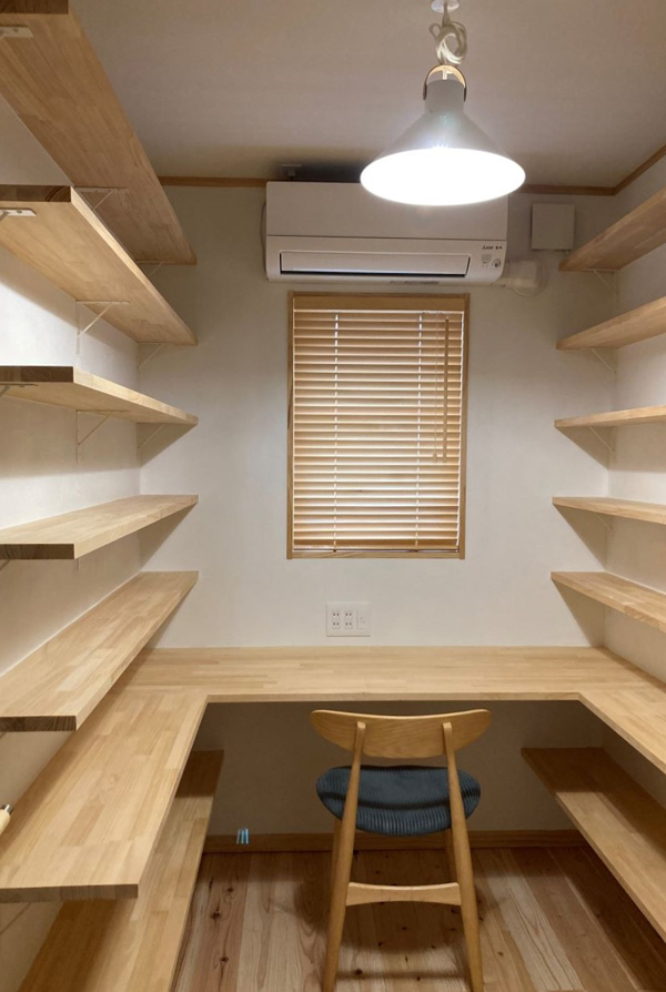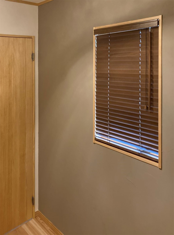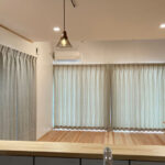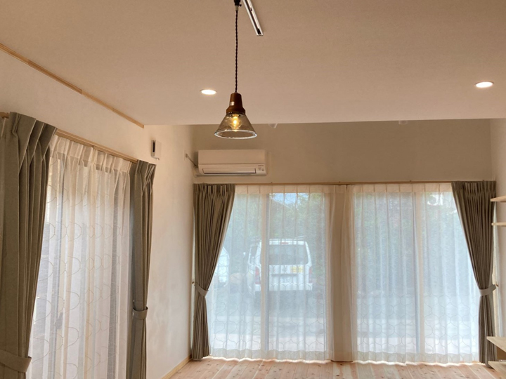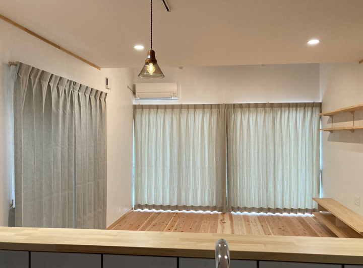 壁や床など、自然素材にこだわった新居にとても合ったカーテン・ウッドブラインドをお選びいただきました。リビングに吊り下げた、ガラスと木のセードがおしゃれなペンダントライトはインターフォルムの物で、当店でご購入いただきました。