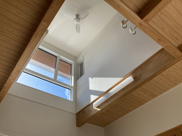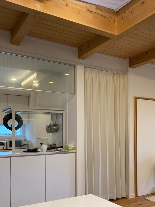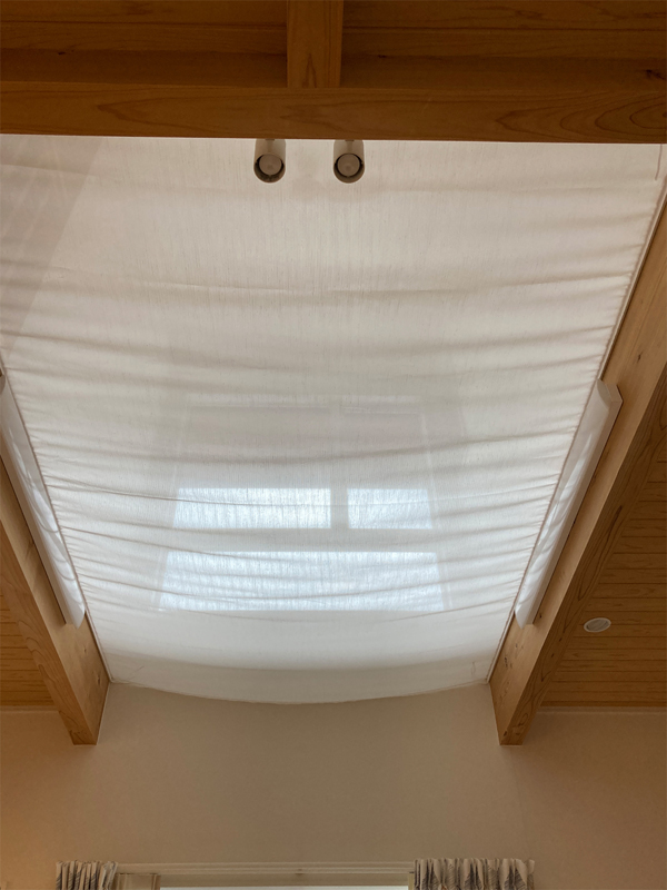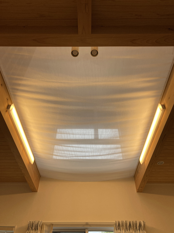 吹き抜けのあるリビングで良くある相談なのですが、冬に暖かい空気が抜けてしまってお困りでした。天幕を取付したいとのご要望でした。