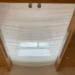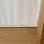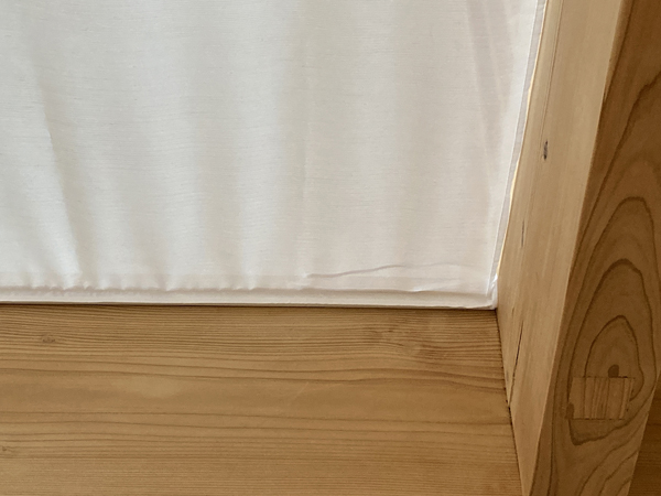吹き抜けの明るさは大切にして、生地は透け感のある採光拡散効果のあるレース生地です。300㎝記事幅があるので、継ぎ目のない1枚の幕が作れました。カーテンのバランス用のマジックテープカーテンレールを梁に直付け、マジックテープを縫い付けたレース生地を取付します。