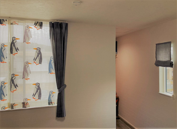 リビングとダイニングと繋がった間取りです。リビング側、ダイニング側の窓はカーテンもレースもデザインは一緒ですが、それぞれ色違いにする事で、場所ごとの雰囲気が楽しめます。子供部屋の窓は、ペンギン柄のレースに落ち着いたパープルグレーのカーテンでおしゃれな絵を飾っている様です。