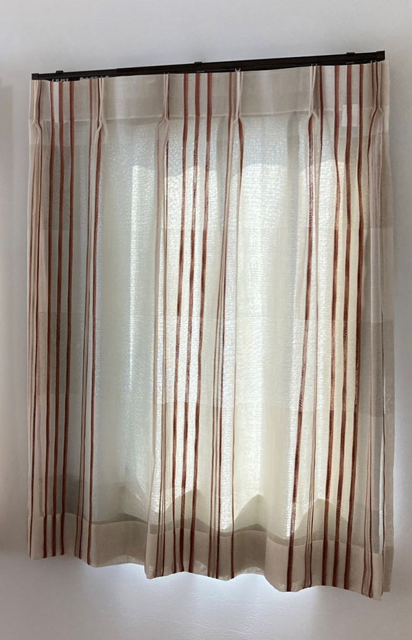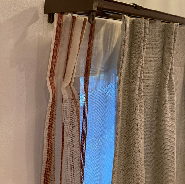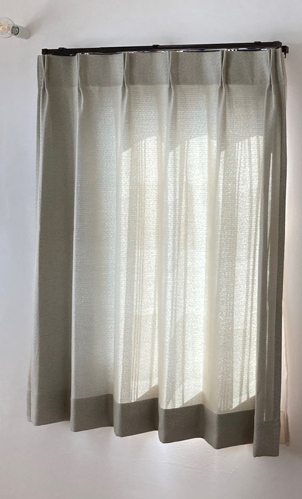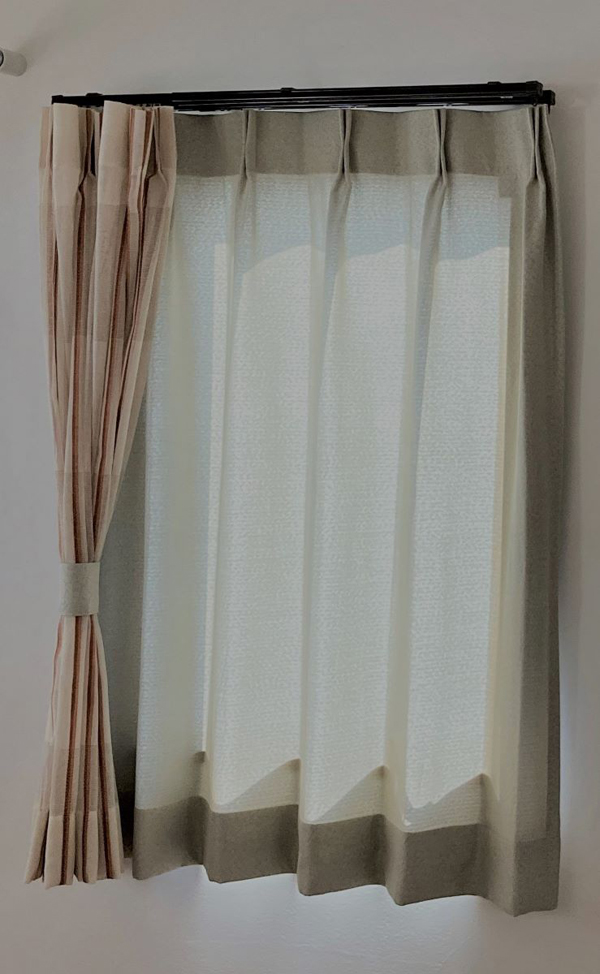 リーズナブルな金額でもデザインを楽しめるカーテンをご提案。カーテンを部屋側、レースを窓側と固定することなく、入替できる様にカーテンとレースを同寸法でお作りする事をご提案しました。