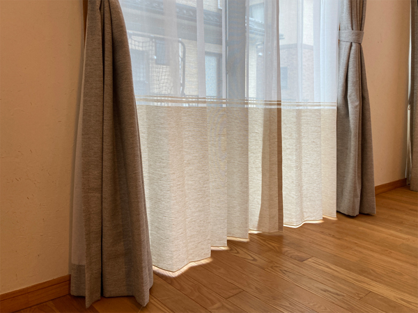 カーテンはウールの様な質感のあるヘリンボーン織の生地です。レースカーテンは裾に切り替えの入った横使いの生地で縦の継ぎ目がないカーテンになっています。上部は透け感のある生地と、透け感のない麻混生地が裾に配置された面白いデザインです。麻の色をそのまま使用したおしゃれでナチュラルな質感がお部屋の塗り壁と良く合っています。