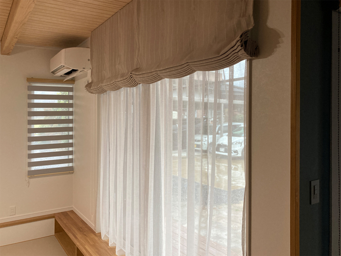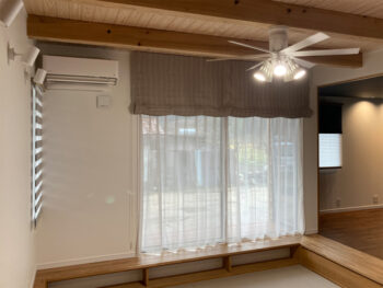 ご新築されたお家のイメージに合うカーテンを取付したい。全て遮光性のあるものを使用したい。こんな感じにしたいというイメージをしっかり持っておられたので、その雰囲気に合いそうな商品をご紹介しながら進めていきました。