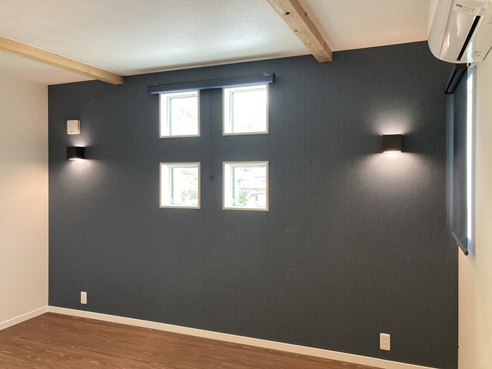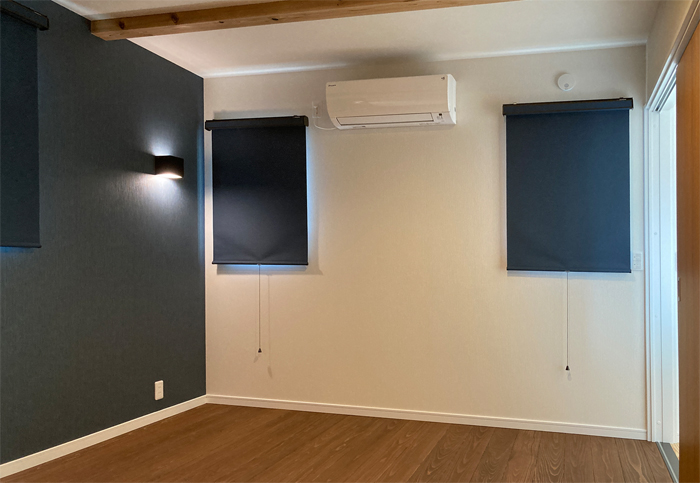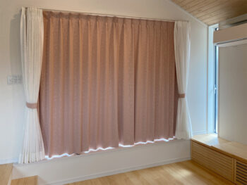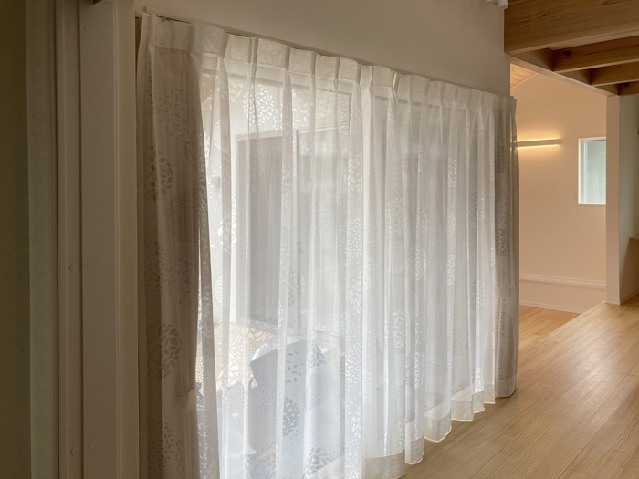 はじめからフロントレーススタイルをご希望されておられました。そこで、ドレープカーテンが良く見える透け感のあるレース生地をご提案していましたが、人通りが多いとの事から最終的には日中外から透けないミラーレースカーテンが採用になりました。レースカーテンの柄の部分でうまい具合に遮光カーテンの色が透け、無垢材の床に合う柔らかな雰囲気になりました。最近人気のフロントレーススタイルのカーテンコーディネートは、ドレープ生地にレースの素敵な模様が浮かび上がるので、とてもおしゃれな雰囲気になります。2階のお部屋は全てロールスクリーンです。寝室の4つの小窓は1台の遮光ロールスクリーンですっきりとまとめました。子ども室は明るい雰囲気に合わせてクリーム色のロールスクリーンです。