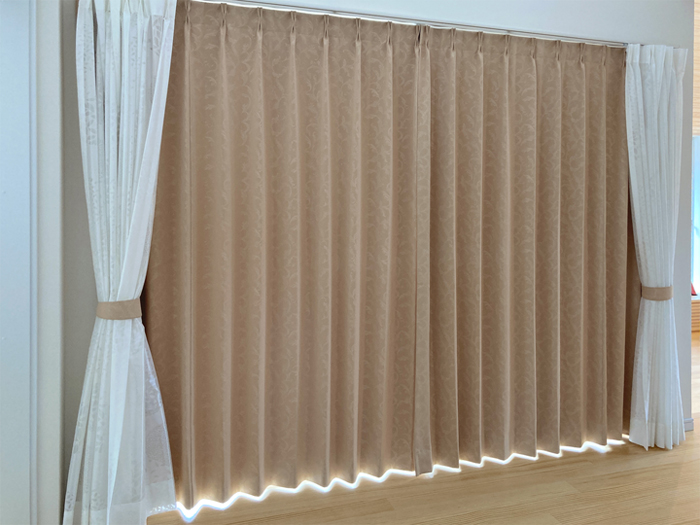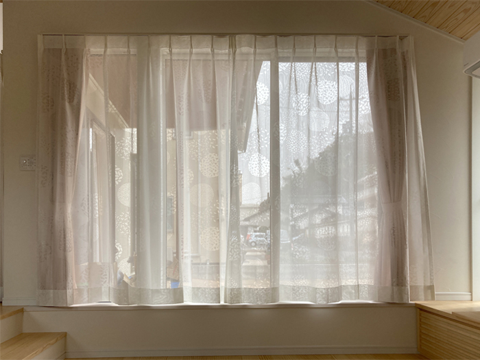 1階はリビング側の窓が割と人通りが多いのでミラーレースカーテン、遮光カーテンを取付したい。カーテンはレースカーテンが部屋側にくるフロントレーススタイルにしたい。2階はスッキリとロールスクリーンを取付したい。