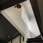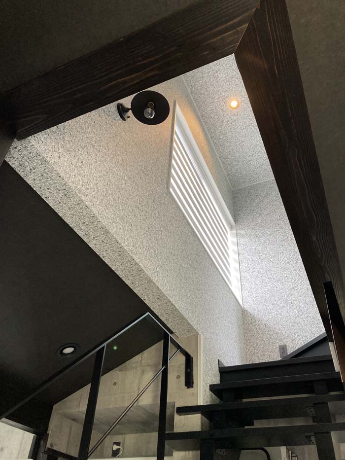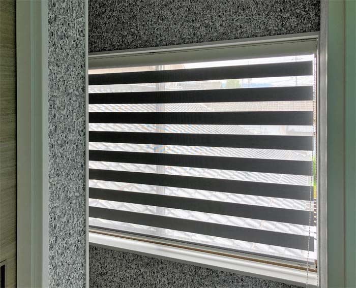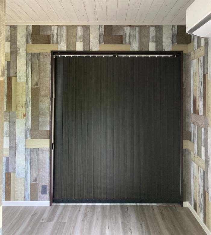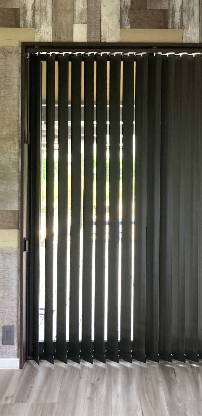 木目のプリントの縦型ブラインドは、より高級感のあるお部屋に仕上がりました。調光ロールスクリーンは室内と外の景色の印象の違いを緩和してくれています。