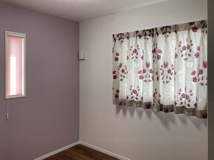 洋室2部屋はクロスに合う色調で、楽しくなるようなカラフルな感じに仕上がりました。リビングダイニングは非遮光のカーテンのデザインを気に入っていただきました。シックなパープル系の花柄ですが、日中は逆光で見えなくなってしまうので、遮光裏地を取り付けて日中も柄が楽しめる様にしました。遮光裏地を付けるメリットとして、日差しの強い時は遮光できる事、表生地を紫外線から保護する事、間に空気層ができるので保温性のアップなどがあります。価格は裏地の分あがってしまいますが、気に入ったデザインのカーテンを長くお使いいただける事ができます。