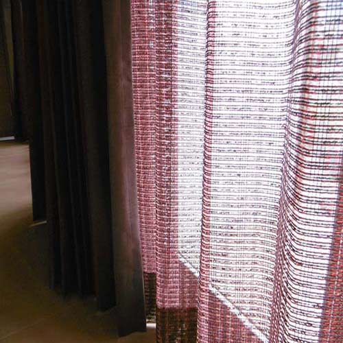 ワインカラーのレースカーテンが印象的です。アイボリーなどレースカーテンは白っぽい色を使う事が多いのですが、色付きのレースカーテンもお部屋によっては良く合います。先にレースカーテンが決まったので、ドレープカーテンはネップの入ったダークワインの無地でシックにまとめました。