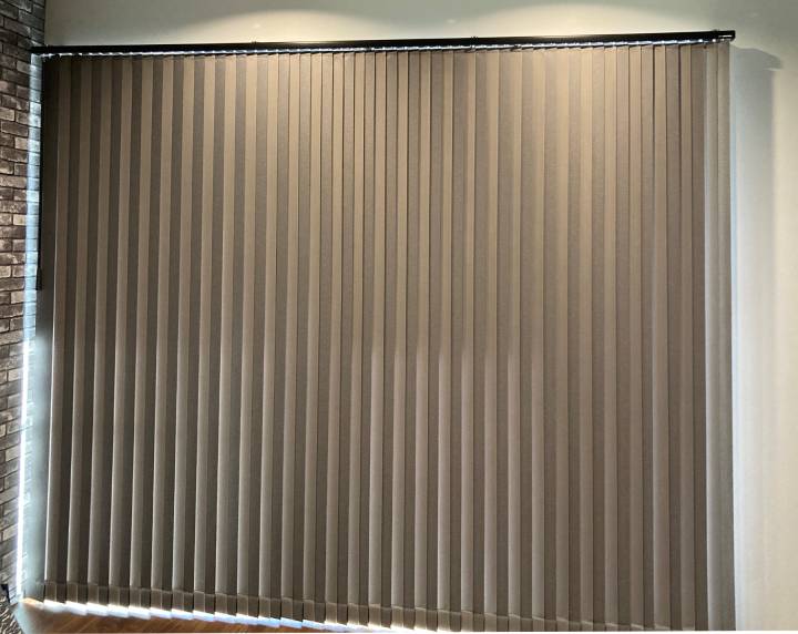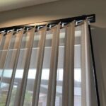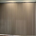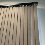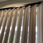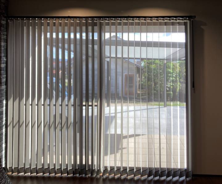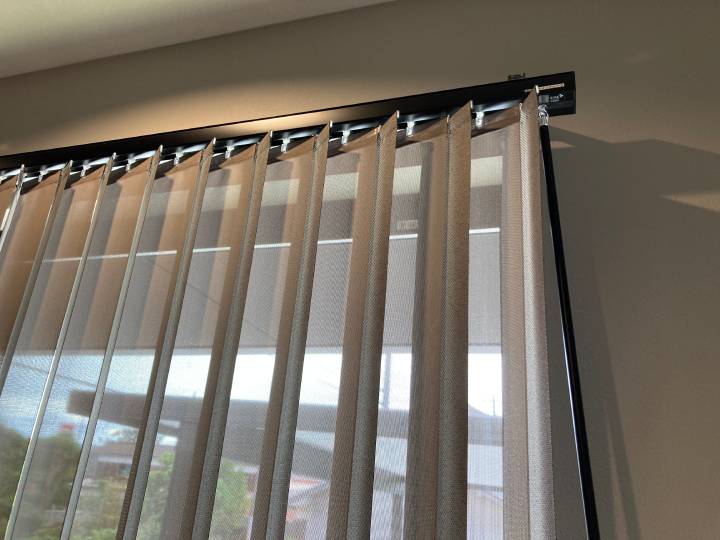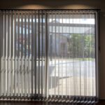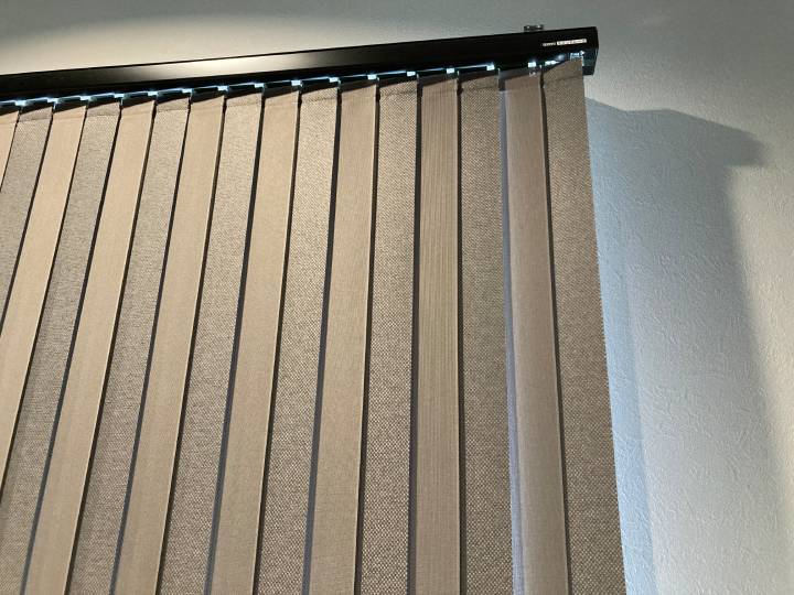 ラインドレープ(タテ型ブラインド)の弱点を解消したペアタイプを取付しました。遮光生地とレース生地を交互に配して光と視線をコントロールします。