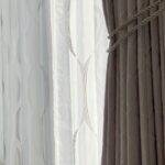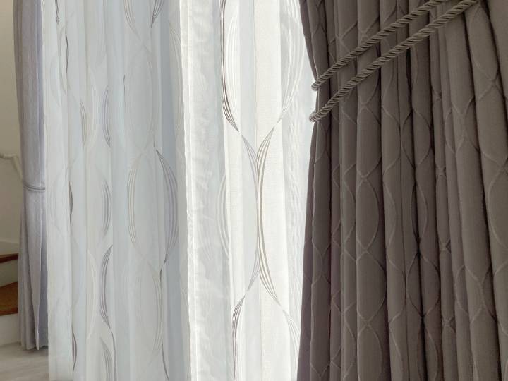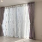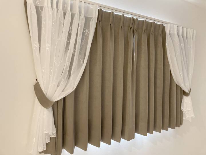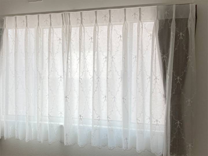 リビングは先にレースカーテンの気に入った物が見つかり、それに合うドレープカーテンを探して決められました。ホワイトとグレー2色の刺繍でデザインされた緩やかなウェーブのレースカーテンに、立体的なウェーブ模様が特徴のドレープカーテンとの組み合わせになりました。洋室はピーチスキンのような質感の遮光カーテンと、シワ加工されたボイル生地に刺繍の入ったエンブロイダリーレース(生地に刺繍が施されたレースカーテン)の組み合わせです。