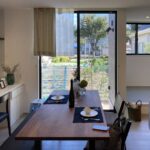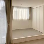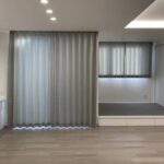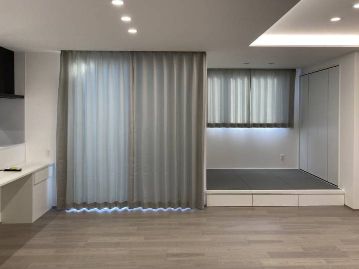ホワイトの壁、グレーのフロア、グレーの琉球畳にピッタリマッチするカーテンになったかと思います。カーテンの縫製を裏表逆にする事は大体の生地で可能です。裏面を気に入ったからという以外にも、外に向けて柄を見せる様にするなど、オーダーならではのカスタマイズができます。