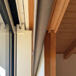 設置可能な商品としてアルミブラインド、プリーツスクリーンなどご紹介しましたがロールスクリーンをご希望でしたので、ニチベイのミニマルタイプをご提案しました。通常のロールスクリーンはウェイトバーが丸い棒状になっており、バーだけで1㎝程奥行きを取ってしまいます。ミニマルタイプはウェイトバーが板状になっていること、巻取りのパイプ径が通常より細いのでコンパクトに納まります。巻き上げても前後数ミリずつ余裕があり、奥行き7㎝の場所にも設置する事ができました。